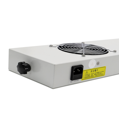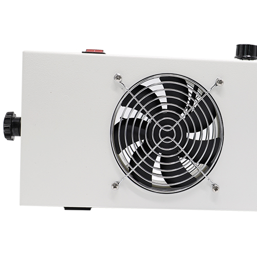 Overhead-Gleichstrom-Ionisator (DC) mit zwei Lüftern, automatisch reinigenden Emitterspitzen und stufenlos regelbarem Luftstrom in leichtem Aluminium-Gehäuse mit einer Balance von +/- 10 V und einer Entladezeit von < 3 s.