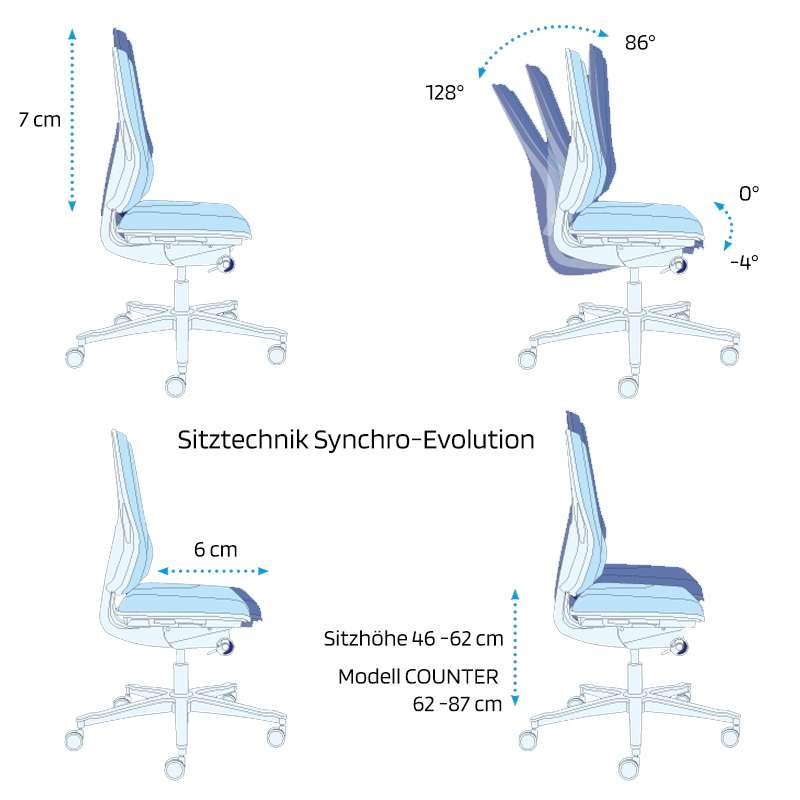- Sitztechnik: SE Synchronmechanik/Syncro Evolution mit dreistufiger Sitzneigeverstellung und Sitztiefenverstellung (6 cm)