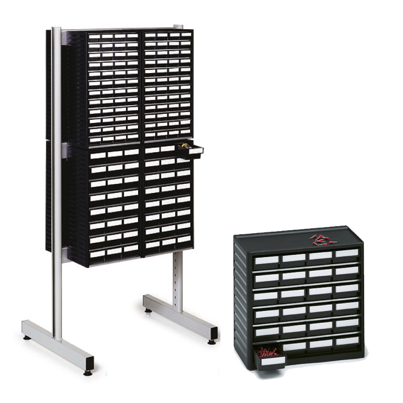 Schubladengröße T x B x H: 300 x 186 x 82 mm, Magazin hat einen Stahlrahmen mit verzinkten Etagenböden, enthält PP-Schubladen mit Schutzscheiben und Etiketten, mit Anschluss für Erdungsleitung.