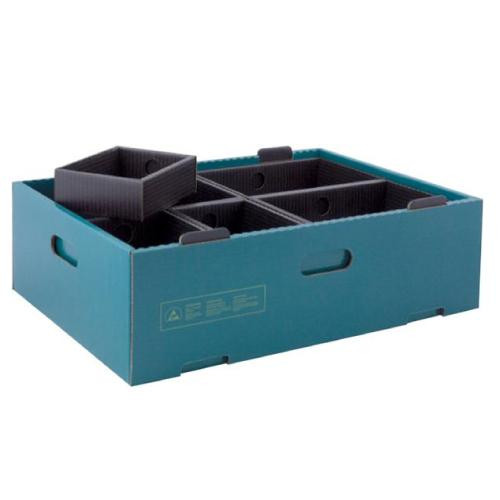 cortronic shipping box, erected, blue, with ESD warning imprint, incl. 1 electrically conductive studded foam and 1 PU plug-in foam.