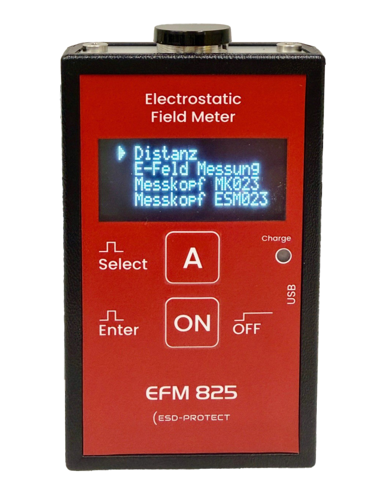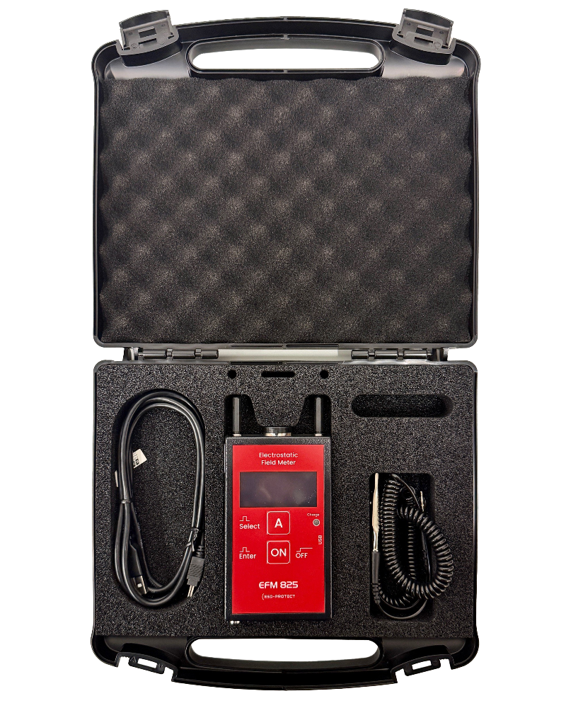 EP-EFM 825 electric field meter with 4-line OLED display, monitor with hold function, USB interface and display of charge in volts. The EP-EFM 825 is supplied in a practical ESD case set.